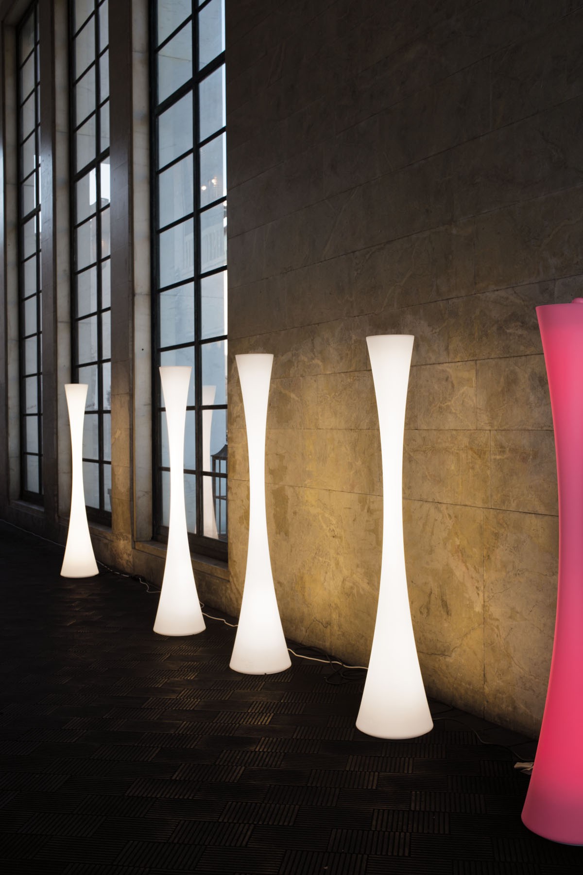 Lampada da terra a luce diffusa per outdoor, struttura stampata in rotazionale, materiale polietilene bianco.