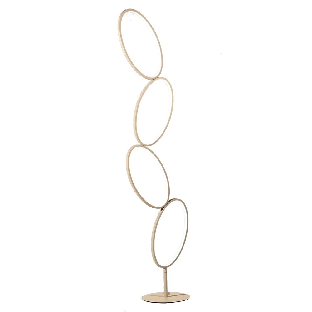 Lampada da terra LED dimmerabile, struttura in metallo color oro e diffusore in acrilico e silicone.