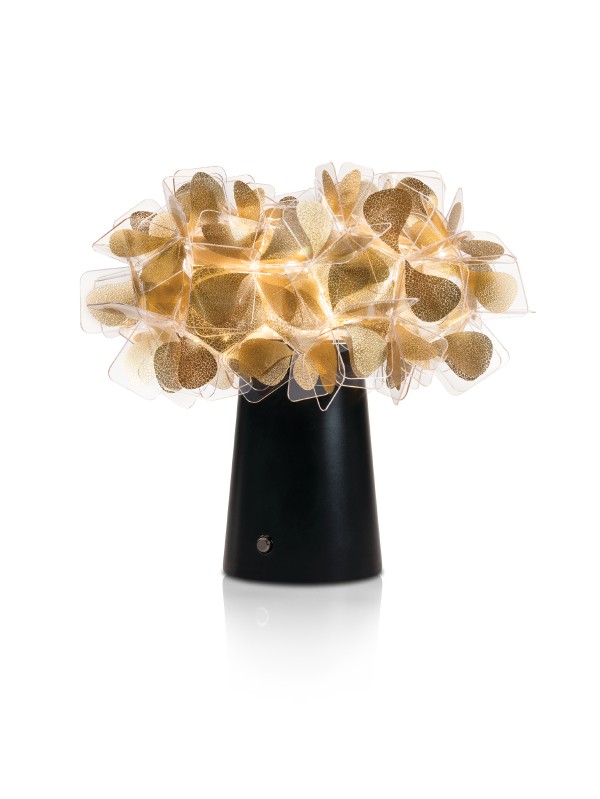 Forme regolari incastrate in un perfetto equilibrio di trasparenze e riflessi compongono il design di Clizia Mama non Mama. La lampada riprende le forme della natura: è una nuvola che cattura la luce del sole delle prime ore del giorno e si carica di riflessi cangianti, è la chioma di un albero attraverso la quale la luce filtra e crea giochi con le ombre. La versione da tavolo battery della Clizia Mama non Mama, creata in occasione dei 10 anni della collezione best seller, è disponibile in 3 diverse colorazioni della base: bianco e nero, diffusore Mama non Mama gold.